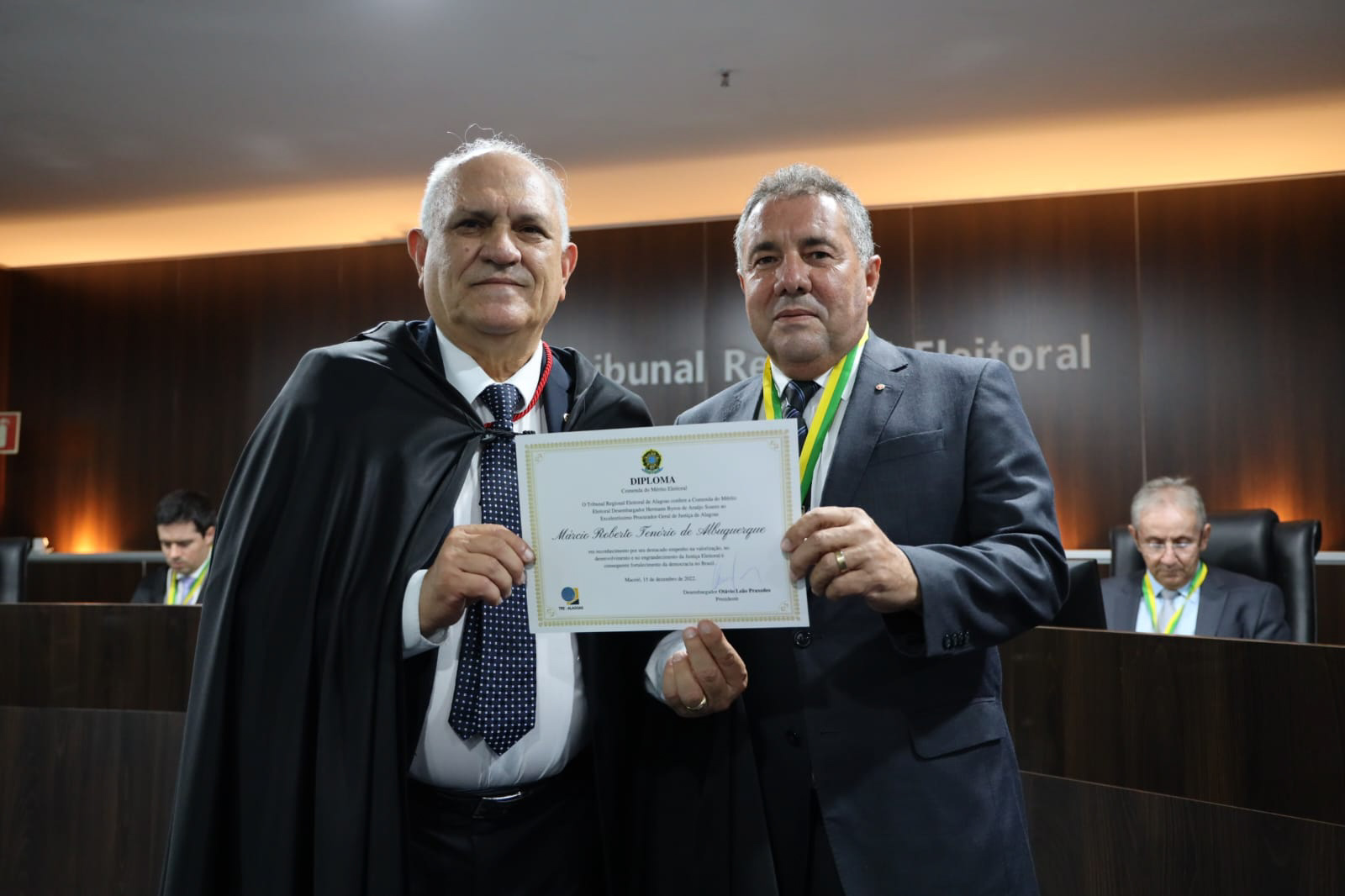 O procurador-geral de Justiça, Márcio Roberto Tenório de Albuquerque, recebeu a Comenda do Mérito Eleitoral Desembargador Hermann Byron de Araújo nesta quinta-feira (15). Concedida pelo Tribunal Regional Eleitoral de Alagoas, a Comenda é a maior honraria concedida pela instituição e tem como objetivo reconhecer o trabalho de autoridades que atuam pelo bom andamento do processo eleitoral.
