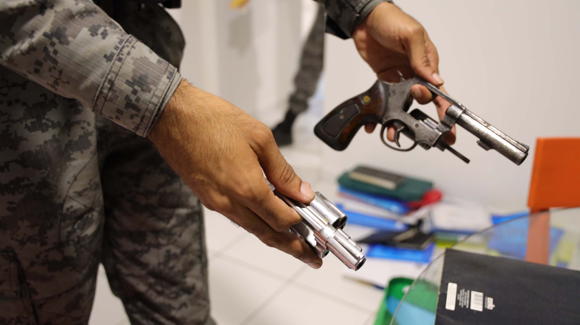 Dos investigados também foram apreendidas folhas de cheques, iphones e smartphones, notebooks, maquineta, contratos e registros de terrenos; HD’s, revólveres do calibre 38, além de munições de espingarda do calibre 12, notebooks, CPU’s, documentação.