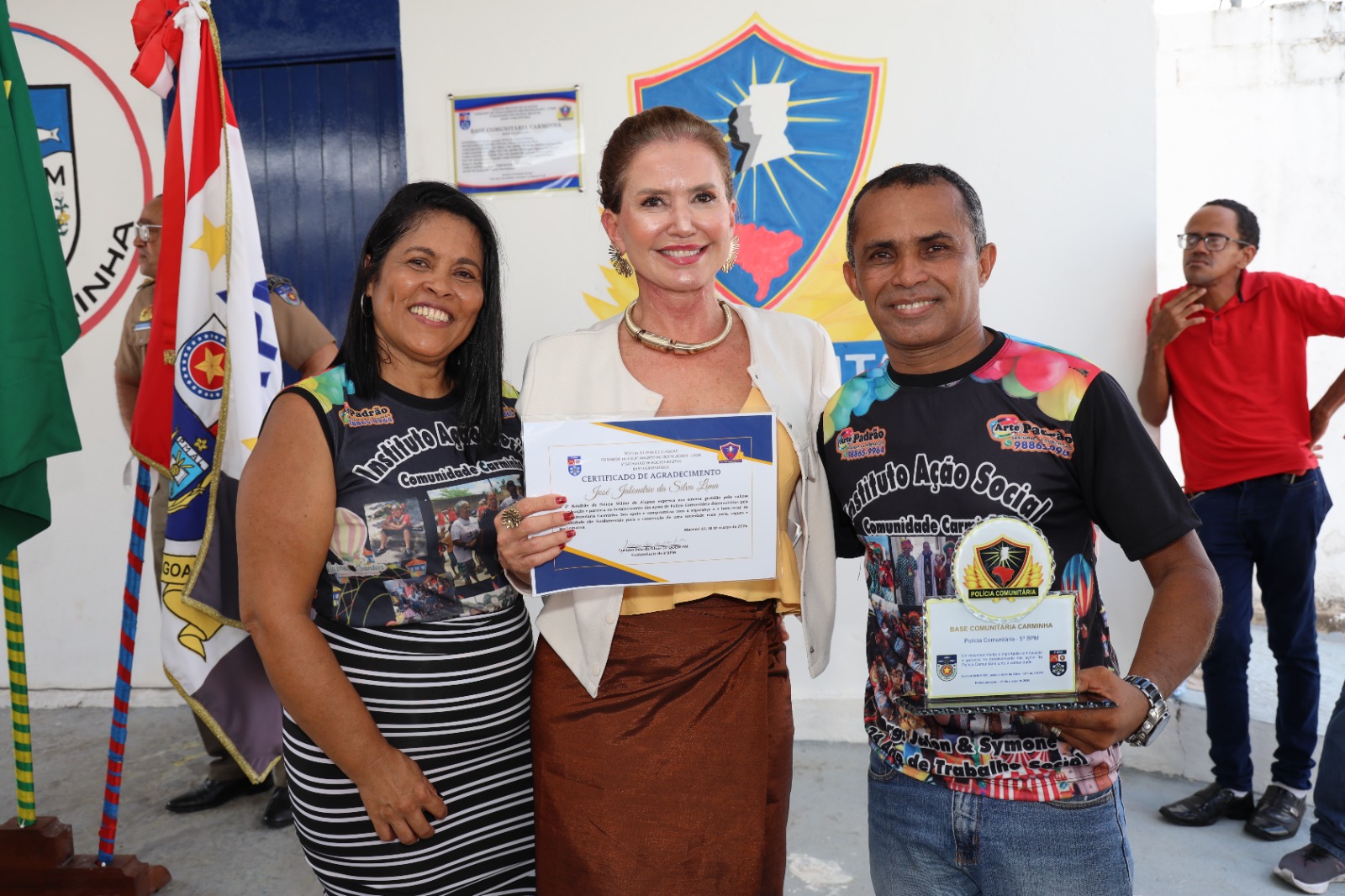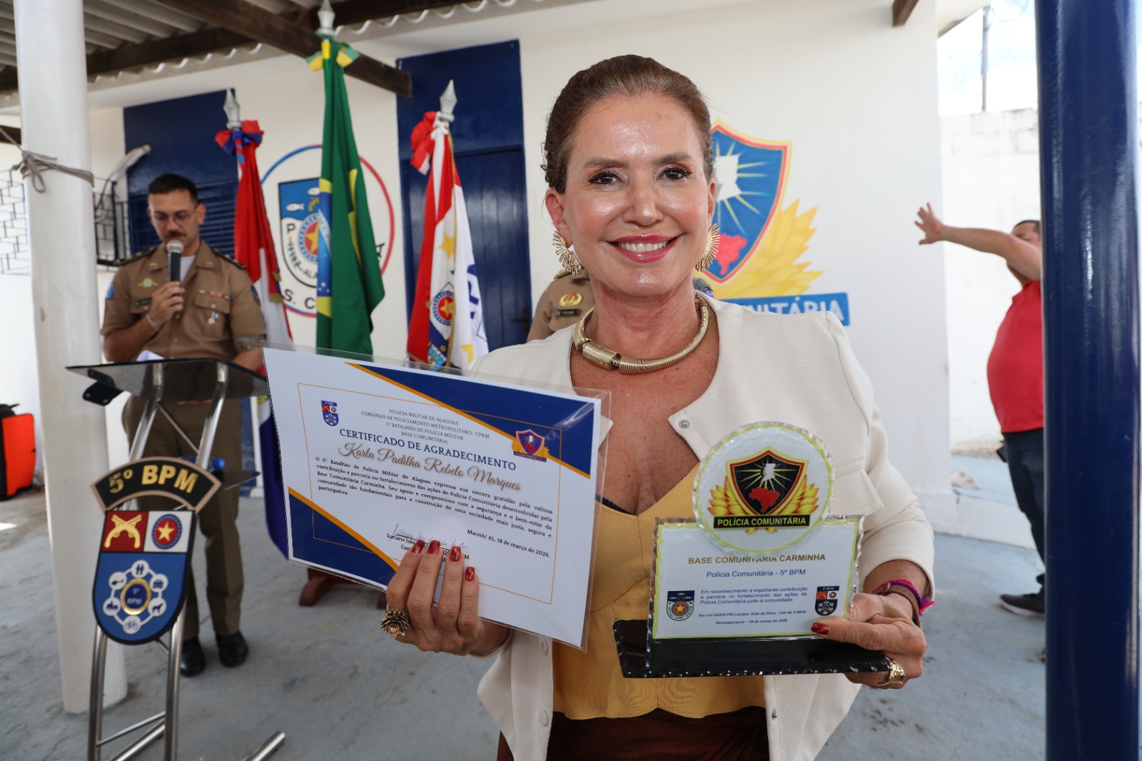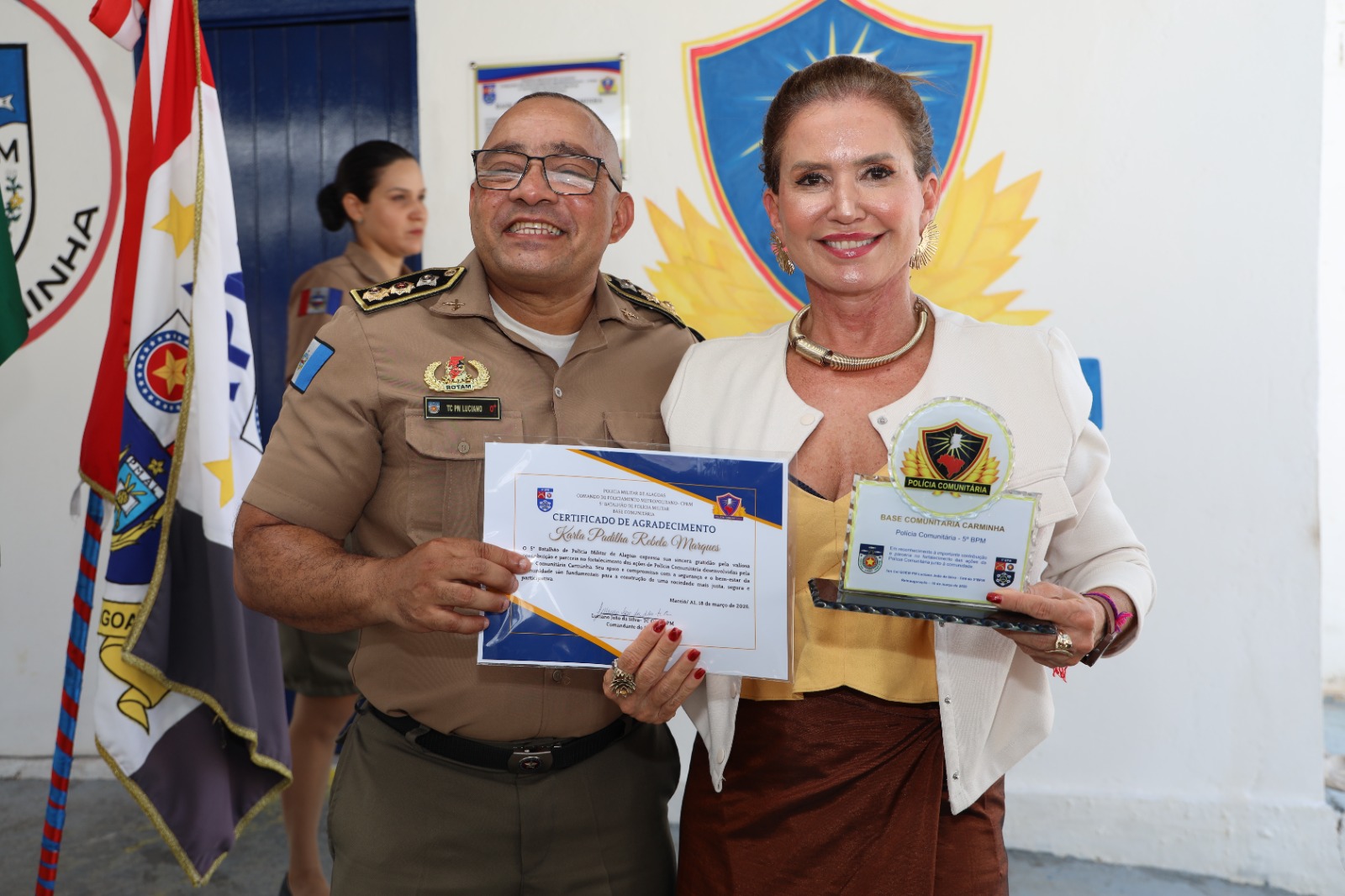 Contribuir para garantir que policiais militares trabalhem em um espaço digno, dessa forma sejam motivados a desenvolver com maior eficácia as suas atividades. A promotoria de Justiça do Controle Externo da Atividade Policial, do Ministério Público de Alagoas (MPAL), não existe para punir, mas cobrar que direitos sejam respeitados, deveres sejam colocados em prática e tudo transcorra dentro da legalidade. A prova disso é que, na manhã desta quarta-feira (18), a promotora de Justiça Karla Padilha, titular da mencionada promotoria e, também, coordenadora do Núcleo de Controle Externo da Atividade Policial, participou da reinauguração da Base Comunitária do Carminha, no Complexo Benedito Bentes, onde foi homenageada em reconhecimento aos equipamentos adquiridos e doados àquela unidade da Polícia Militar de Alagoas, por meio do “Projeto o Preço do Crime”, de sua autoria. Para o bom funcionamento da base, o MPAL conseguiu doar fogão, geladeira, ares-condicionados, cadeiras, mesas e computadores